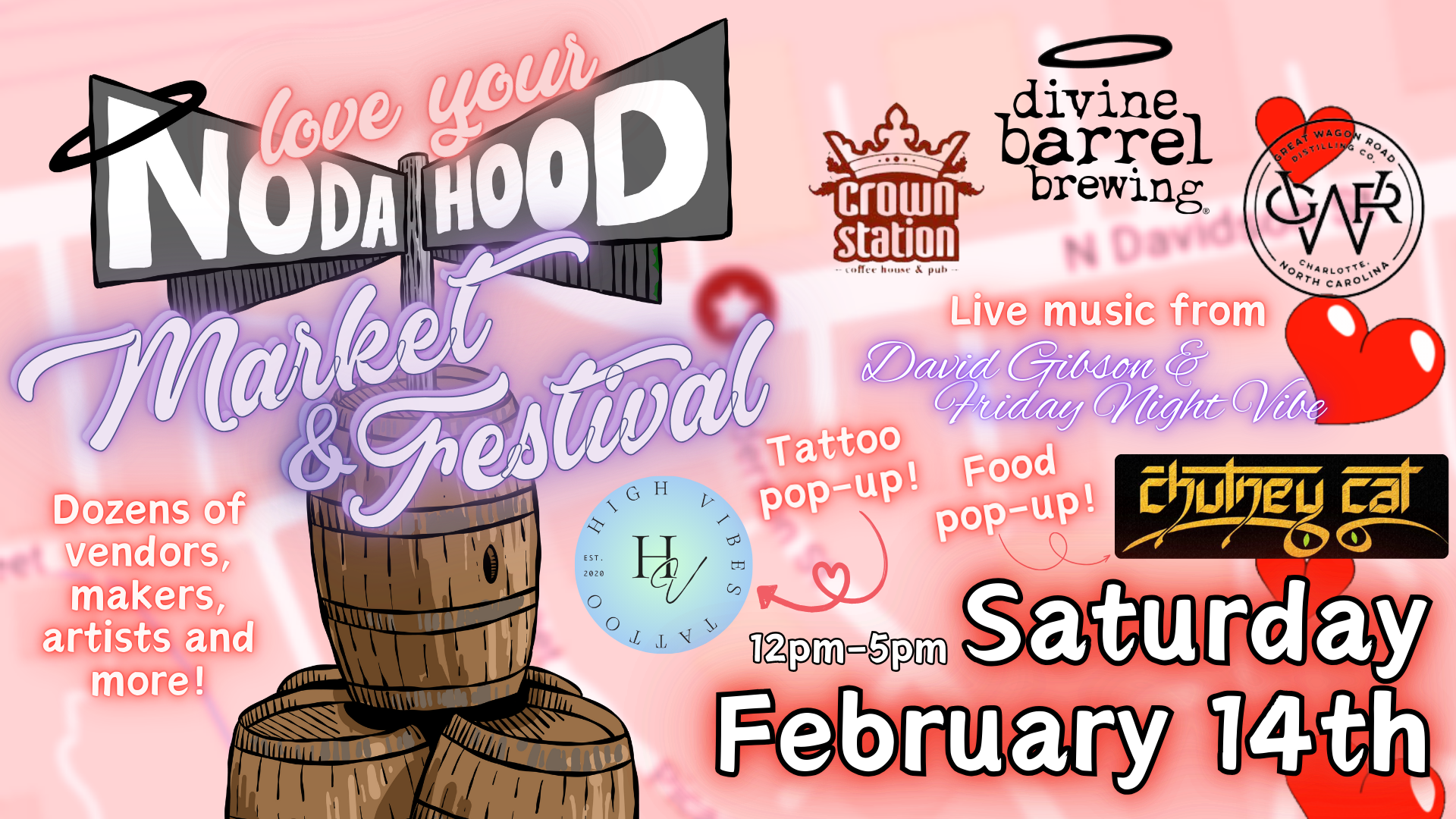 FeaturedDivine Barrel Brewing 3701 North Davidson Street, Charlotte, NC, United StatesThe LOVE YOUR NODAHOOD Market & Festival is Saturday, February 14th from 12-5! Shop small with local vendors, artists, and food trucks; vibe to live music and artists; and LOVE your Nodahood!