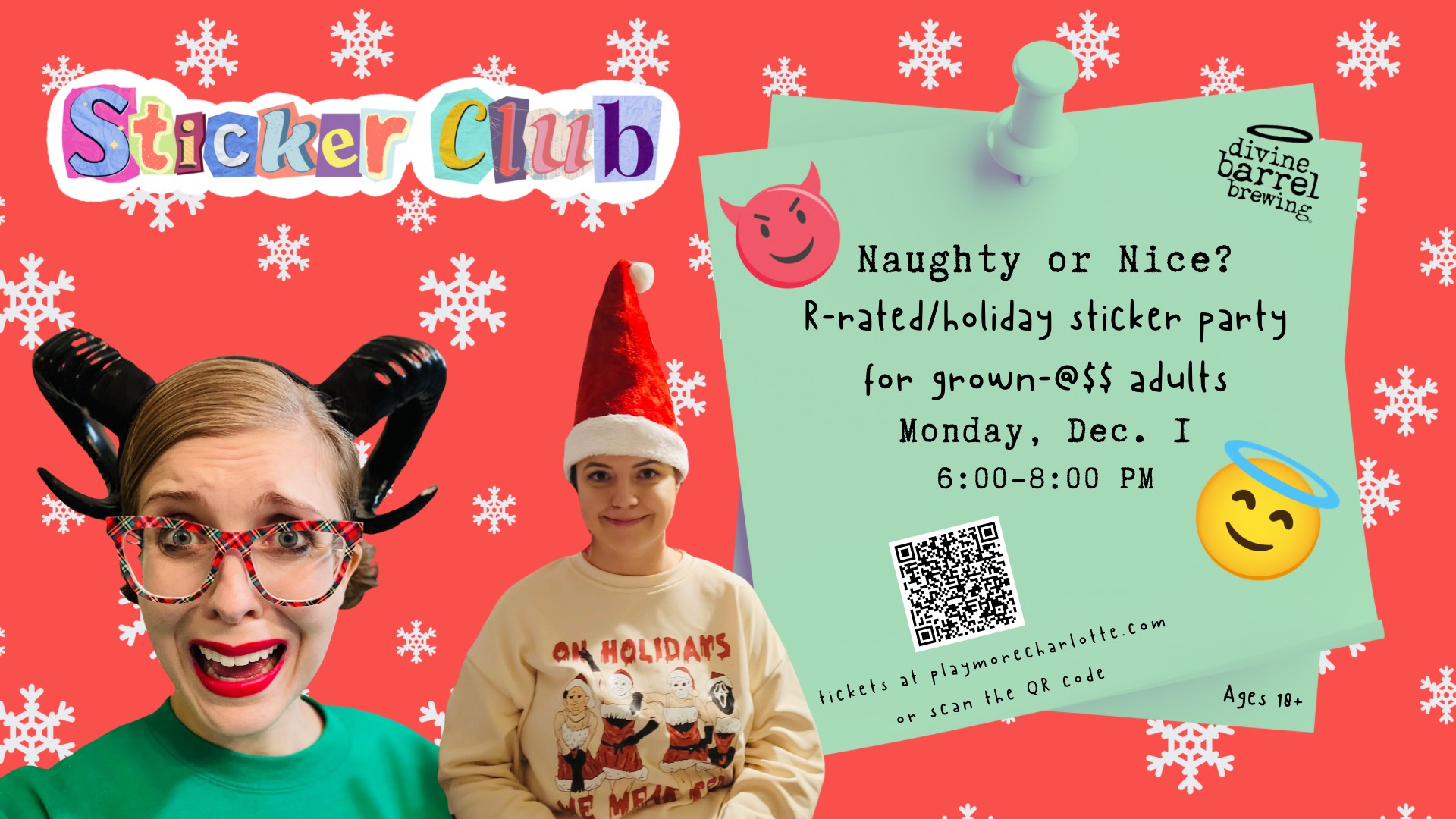R-Rated Sticker Club is back, but this time, it's festive. Join Play More Charlotte and Creation Sake for this month's sparkly and sultry Sticker Club for Grown-Ass Adults!
